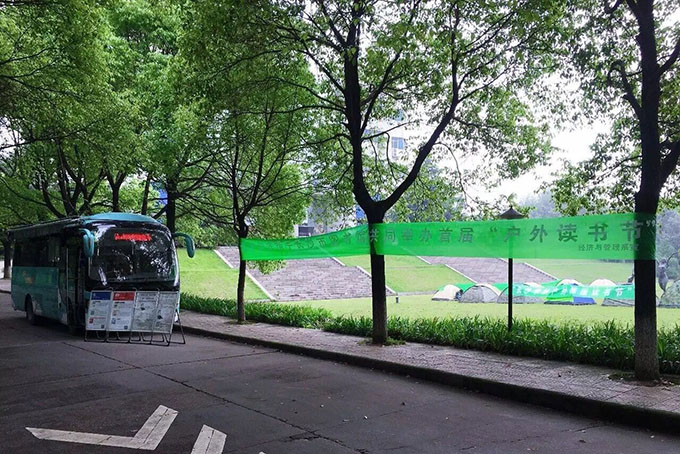 为响应省委省政府“倡导全民阅读,共建文明湖南”的号召,拼搏app登录入口经济与管理系在2016年伊始和长沙市图书馆合作开启“读书工程”建设,拼搏app登录入口作为此次“书香湖南•湘江阅读季”主题活动的分会场,除举办“读书分享会”活动外,经管系还于4月27-28日在校园内开展“户外读书节”活动。27-28日,在拼搏app登录入口图书馆前坪举办“户外帐篷读书节”,学生们在帐篷内闻着绿草清香,与书为伴;同时, 27日上午,长沙市图书馆流动图书室进驻拼搏app登录入口,现场为学生提供办理长沙市图书馆借书证服务并提供3000余本书籍供学生借阅。
