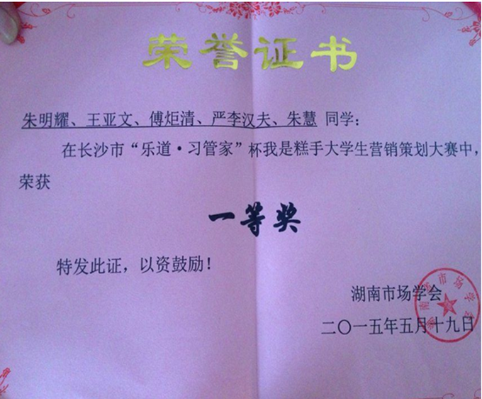 在经管系领导的高度重视和认真组织下,通过指导老师和参赛选手的共同努力,由陈龙山老师带队的ATP团队在长沙市"乐道·习管家杯"我是糕手大学生营销策划大赛荣获一等奖。