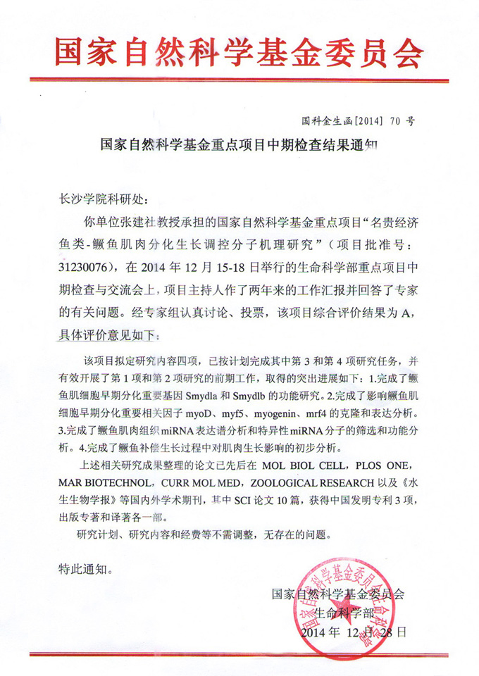 根据国科金生计函〔2014〕70号文件精神,近日,国家自然科学基金委员会生命科学部对拼搏app登录入口张建社教授承担的国家自然科学基金重点项目"名贵经济鱼类-鳜鱼肌肉分化生长调控分子机理研究"(项目批准号:31230076)进行中期检查。2014年12月15日至18日,在生命科学部重点项目中期检查与交流会上,张建社教授对两年来的项目研究工作进行了汇报并回答了专家的有关提问。经专家组认真讨论、投票,该项目综合评价结果为A。