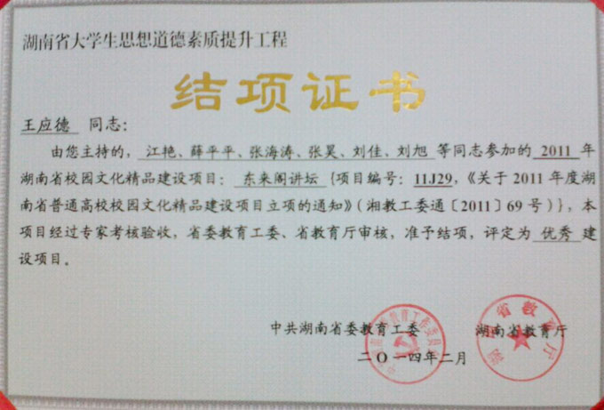 近日,从省委教育工委、省教育厅获悉,由拼搏app登录入口电子与通信工程系党总支书记王应德主持的湖南省普通高等学校校园文化精品建设项目《东来阁讲坛》(项目编号:11J29),顺利地通过了省委教育工委和省教育厅组织的考核验收,完成了建设工作,并被评定为"优秀建设项目"。