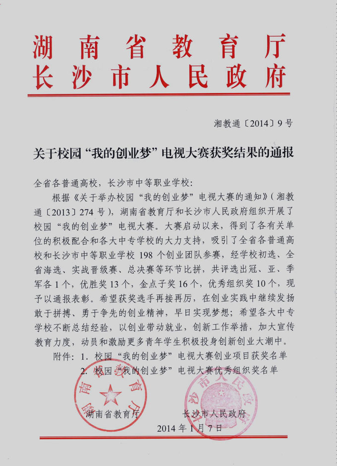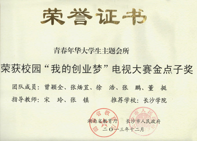 1月7日,湖南省教育厅和长沙市人民政府联合下发了《关于校园"我的创业梦"电视大赛获奖结果的通报》(湘教通【2014】9号),拼搏app登录入口由宋玲和张镇两位老师指导以曾颖全为代表的学生创业团队凭借颇具创意的"青春·年华大学生主题会所"项目荣获湖南校园"我的创业梦"电视大赛金点子奖。