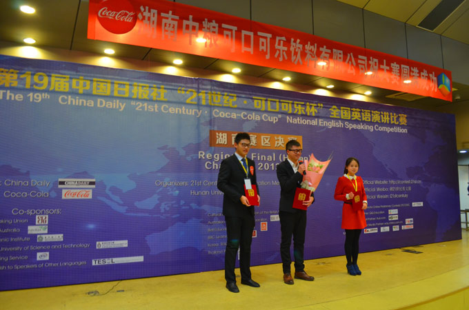 由中国日报社、可口可乐大中华区联合主办的"第19届中国日报'21世纪·可口可乐杯'全国英语演讲比赛湖南赛区总决赛"于2013年12月21日下午在湖南大学逸夫楼报告厅圆满落幕。拼搏app登录入口外语系11级学生蔡任获得冠军,亚军、季军分别由来自中南大学和湖南师范大学的学生获得。三位选手将代表湖南省学子进军全国总决赛。