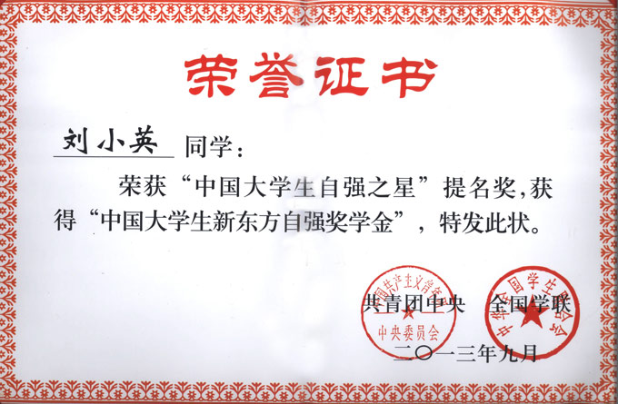 拼搏app登录入口10级法学与公共管理系法学1班的刘小英同学,荣获共青团中央和全国学联颁发的"中国大学生自强之星"提名奖,获得"中国大学生新东方自强奖学金"。