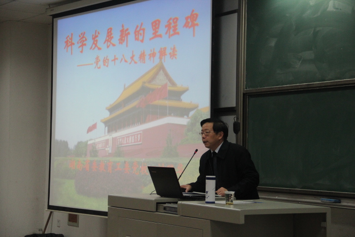 刘国华教授以十八大报告中"新主题、新内容、新论断、新战略、新标准、新目标、新举措、新要求"的八个"新"展开对党的十八大精神的解读。阐述了十八大报告中指导思想增加新内容,发展道路更加明确,发展目标更加具体,对发展形势的认识更加清醒,科学发展主线更连贯、更突出的重要观点。