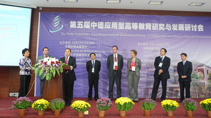 10月10日-12日,第五届中德应用型高等教育研究与发展研讨会在安徽科技学院召开。本次会议的主题是应用型高等学校专业与课程建设、教育教学方法改革。来自中、德两国40余所高校及企业的80多位教育行政部门领导、大学校长、教务处长参加了研讨会。刘耘院长应邀出席会议,并作了题为《实施项目化课程教学改革,着力培养学生实践能力》的大会报告。