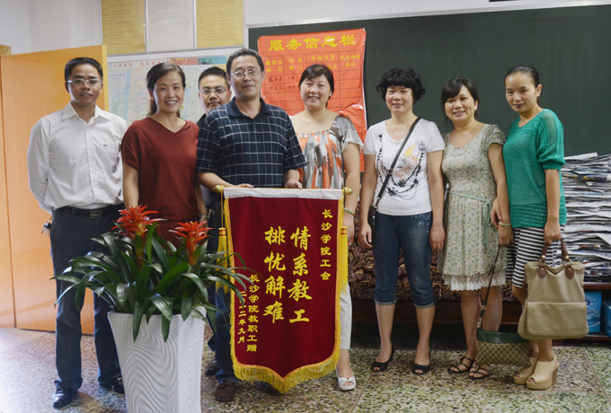 9月17日下午,为感谢校工会解决入学问题,郑斐等数名教职工举着一面绣着"情系教工,排忧解难"的锦旗走进校工会办公室。