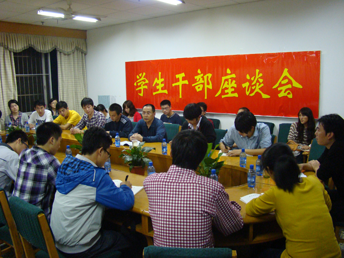 晚上6:30,刘耘院长又来到致远楼1105室,与来自校学生会、社团联合会、各系学生会、团总支,基础学院的30多名学生干部开展座谈,就学生干部在生活、学习、工作上遇到的问题进行倾心交流。