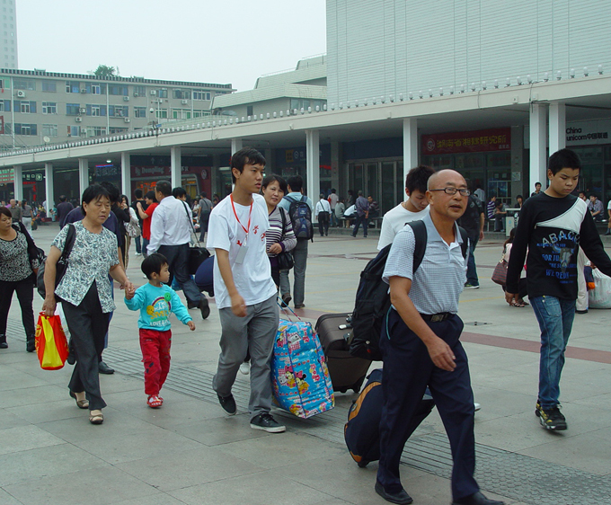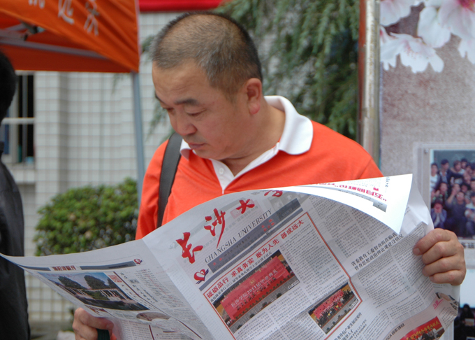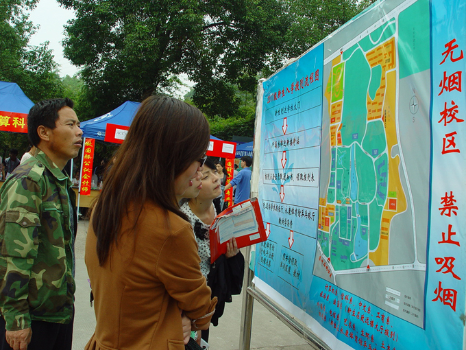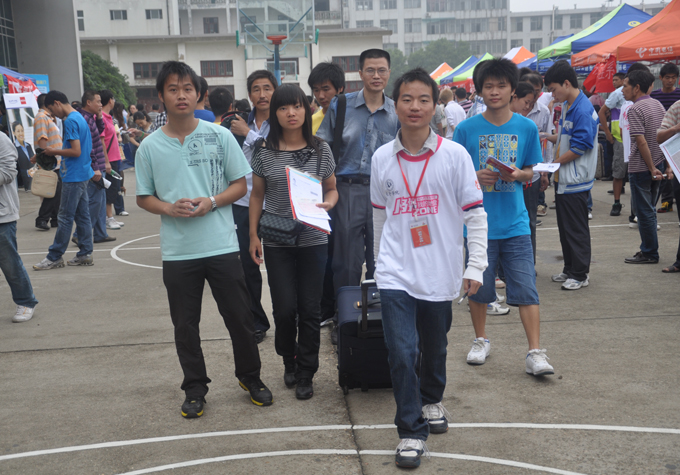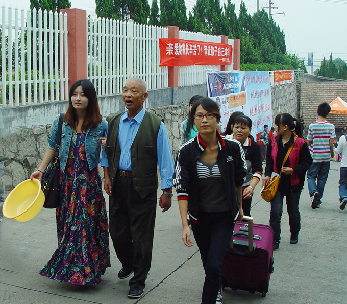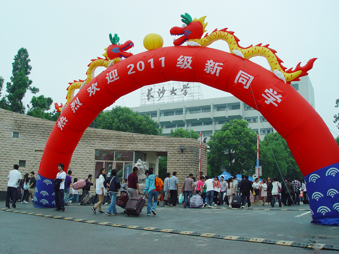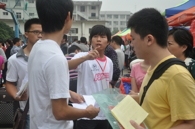 一位新生在学校门口尾随着帮忙提行李的志愿者,不禁感叹说:"太热情了,太好了!一路从火车站到学校,都能够受到学姐学长们的贴心照顾。"家长也含笑点头:"是呀,不单人好,这儿树多、环境也好。"看到他们大袋小袋的行李,真不愧是90后新生--11级家长的心肝,但凡应该是能带的都不漏了。但是从新生身上焕发出的独立和自信又是令人赞叹的,他们有的一个人提着行李,一个人咨询报名流程,"学姐,请问建行在哪儿?我是要改密码的。"这个新生完全没有面对新环境的胆怯,反倒很成熟很自立,在得到指引后又很有礼貌地道谢。许多来自五湖四海的家长们像遇见故人般热切的攀谈起来,一片欢声笑语。说到为什么选择长沙大学,他们有的说全凭孩子的意思;有的说在大城市嘛,见识会广博些;有的就说长沙大学很美呀,是个锻炼孩子认识生活"美"的地方!有的则撇了撇嘴说:"环境是不错,但教学楼、图书馆还有教学设施有待改进"。有的家长抱怨住宿条件太差了,怕自己的孩子适应不了,一脸的溺爱神情,一旁的孩子忙说:"别人住得惯我也住得惯"。新生们差不多都自己报名、领军服、注册,一路上像孩子遇见新鲜事般雀跃,有个刚从图书馆走过来的新生小心端起军服唏嘘说:"原来大学的军服是这样的,和高中都不一样,期待军训。"说到今天是个特殊的日子,看着致远楼里那些忙着指导工作的领导老师们,一位新生挠挠后脑勺笑着说:"今天教师节,辛苦老师们了,真的很谢谢他们"当问到最想感谢的老师时,他只是笑而不语,想是心里有着说不完道不尽的感激吧!第二天报名有专升本的学生、还有从职高升大学的学生,从90后新生、11级家长忙碌的身影和欢喜的脸盘中,我们看到的是知识的魅力、学校的欣荣和祖国的美好未来。