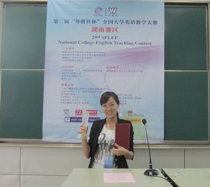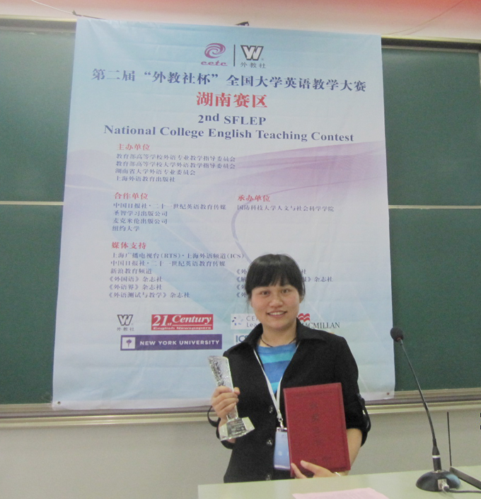 2011年5月12日至15日,第二届"外教社杯"全国大学英语教学大赛湖南赛区决赛在国防科技大学举行。来自包括中南大学、湖南大学、湖南师范大学、国防科技大学在内的全省31所本科院校60名英语教师参加了综合组和视听说组的比赛。大赛分复赛和决赛两场。复赛中各组列前15名的选手进入决赛。拼搏app登录入口公共外语教学部选派的陈瑛和陈杨两位老师经过顽强拼搏,双双晋级决赛。在随后激烈的决赛角逐中,两位老师均沉着应战,充分发挥了自己的教学特长,展示了自己深厚的语言功底,赢得了评委们的一致肯定。最终,陈瑛老师荣获综合组一等奖第一名,陈杨老师荣获视听说组一等奖第二名,为拼搏app登录入口争得了荣誉。