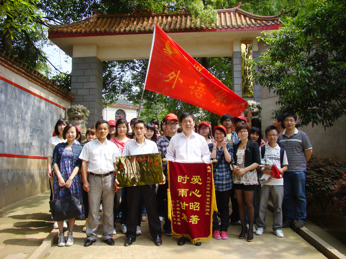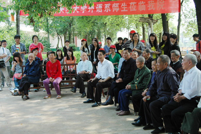 为进一步加强大学生的德育教育工作,弘扬中华民族"尊老敬老"的传统美德,5月6日上午,外语系德育教育基地在长沙市望城县丁字镇敬老院正式挂牌。外语系党总支书记李益带领辅导员张安、刘桢、彭亮及30名学生慰问了丁字镇敬老院的老人,并给他们捐赠了8023元的善款。敬老院院长李国安等热情接待了李益一行。