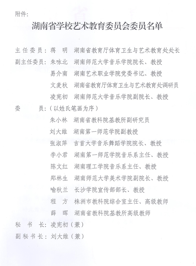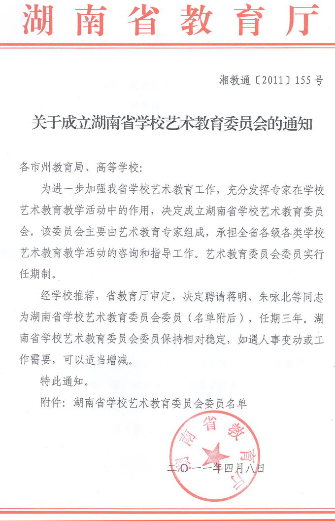近日,接湖南省教育厅(湘教通【2011】155号)通知,省教育厅成立湖南省学校艺术教育委员会,成员由全省高校艺术界知名学者、专家组成,拼搏app登录入口党委宣传部部长喻秋兰教授获此殊荣,任期三年。