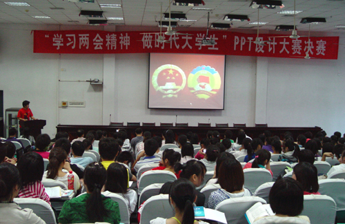 本次大赛共有295份PPT作品参赛,经过历时一个多月的初选和复赛,最后20份作品脱颖而出进入决赛。决赛共分为参赛作品展示和嘉宾点评两个环节。在参赛作品展示环节中,选手们表述流畅,条理清晰,将各自的PPT作品一一展示于前,简明扼要地阐述了两会热议的房价、"三农"、就业、医改等关系民生的焦点问题,并略谈了各自在PPT制作过程中学习两会知识的心得体会。每份参赛作品图文并茂,体现了视听一体化的艺术效果,同时精妙地展示了两会的内容,重点突出了备受关注的"蚁族"和"低碳经济",体现了当代大学生对民生和环保的关注。法学与公共管理系肖卓云清晰的表述,耳目一新的效果,博得了全场观众雷鸣般的掌声。